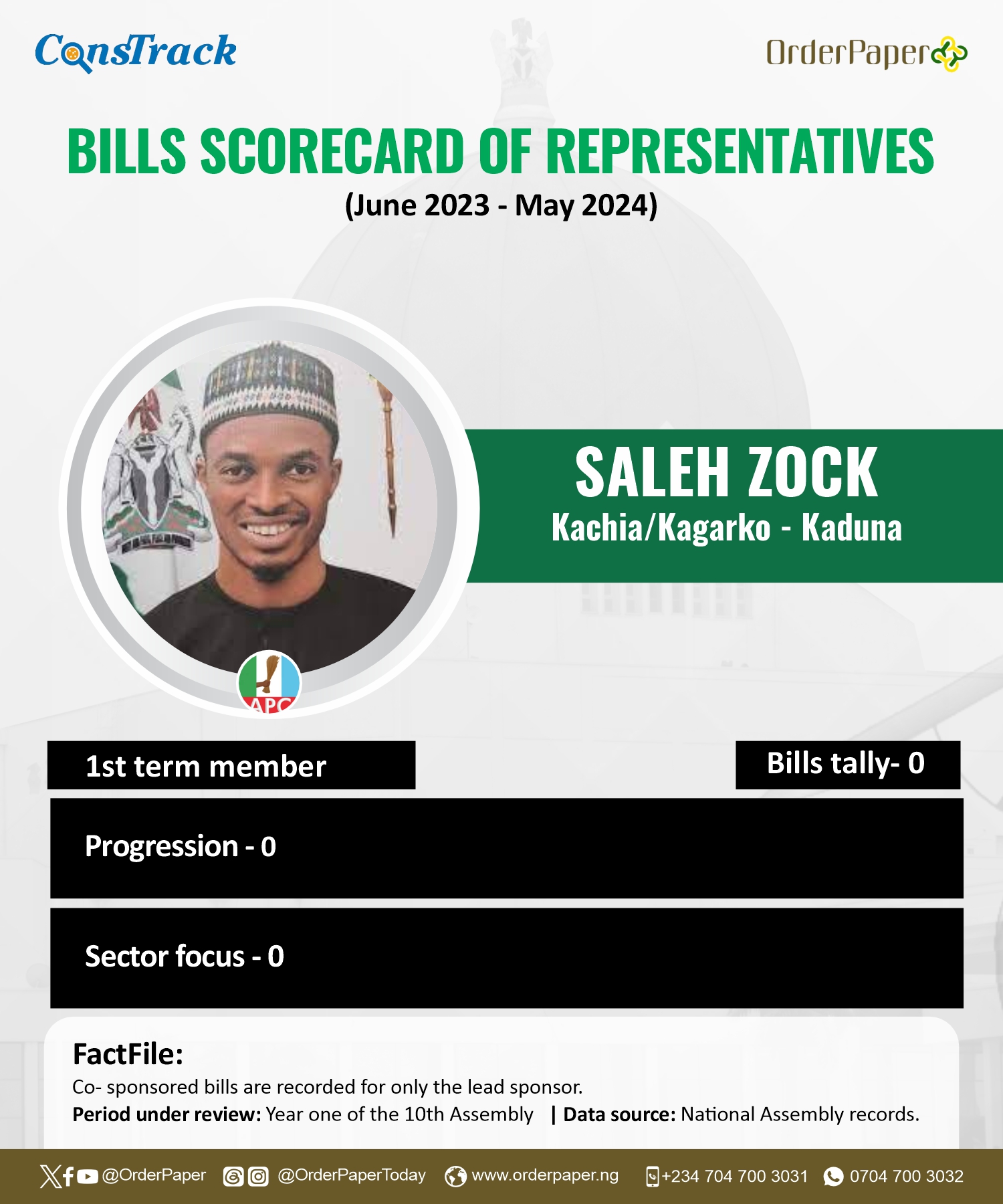 Hon. Saleh Zock Zock iscurrently serving his first-term as a member representing Kachial and Kargarko in the 10th House of Representatives under the platform of the All-Progressive Congress (APC).